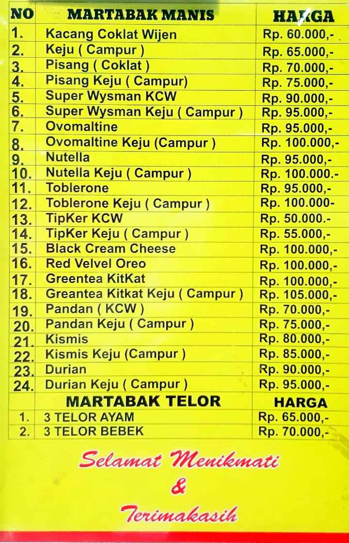 Jangan terkecoh karena banyak kedai martabak yang menggunakan nama Nikmat Andir. Rasa martabak yg sudah anda kenal sejak lama. Daftar harga menu Martabak Bandung 21 2022 lengkap terbaru dan gambarnya di cabang Karet Kuningan review menu jam buka nomor telepon promo alamat cabang peta fasilitas restoran.